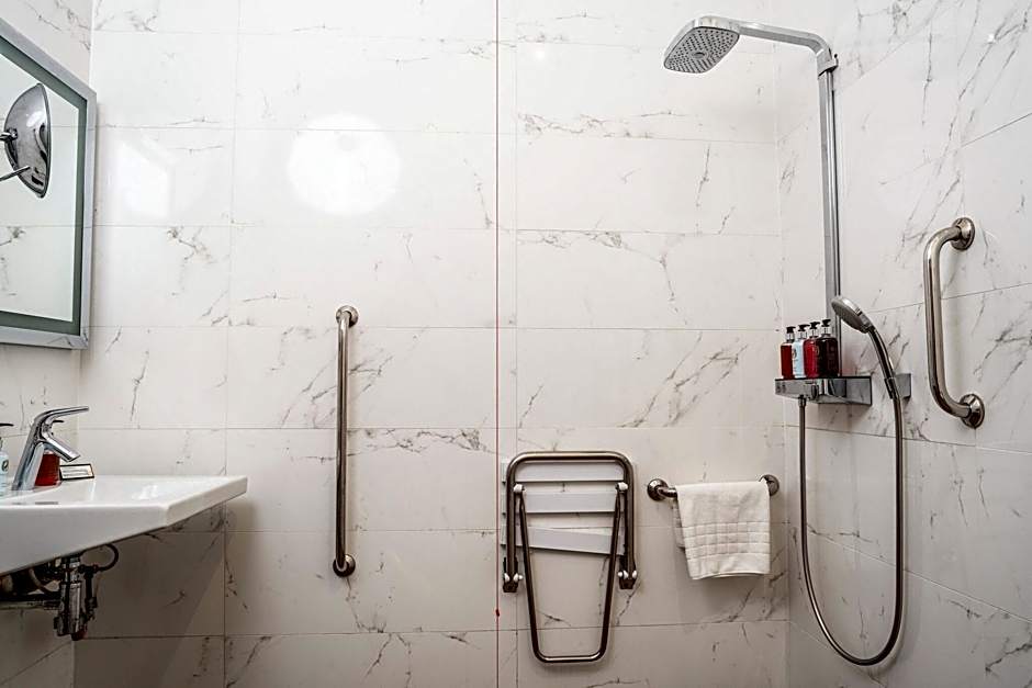 These double rooms are specially adapted for wheelchair use with wider access, low level switches king-sized bed, wet room rainfall shower, blackout curtains, and free tea, coffee, milk.